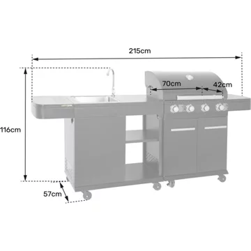 Aménagez facilement votre espace extérieur avec la cuisine modulable FYRA, qui vous permet de concocter de bons petits plats estivaux pour vos convives. Avec ses 4 brûleurs d’une puissance totale de 12 kW fonctionnant au gaz, maîtrisez la cuisson de vos aliments quels qu’ils soient. Grâce à ses 8 roulettes, la FYRA Cook’in Garden se plie à tous vos caprices. Réorganisez votre terrasse ou jardin au gré de vos envies, sans effort. L’armoire et les 2 tablettes ajoutent une touche pratique en offrant un espace supplémentaire pour garder vos ingrédients et accessoires culinaires à portée de main. Et parce qu’une cuisine complète se doit d’être pratique, l’évier intégré vous offre une oasis de propreté.
