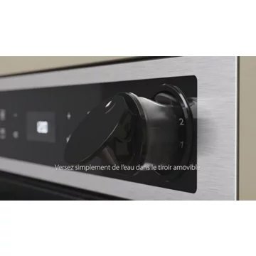 - Avantage de la chaleur tournante avec ajout de vapeur : le four est équipé d’un réservoir d’eau de quelques centilitres, pour apporter l’humidité pendant la cuisson des aliments. Il permet de garantir une cuisson aérée et souple avec une finition croustillante et croquante.
