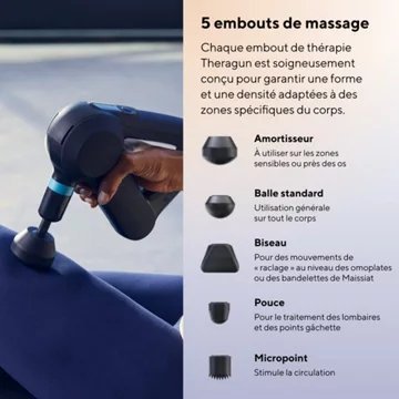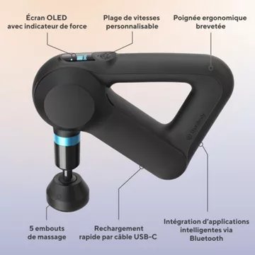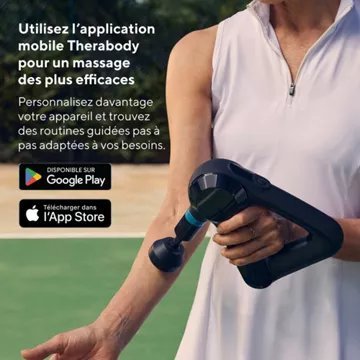 Le Theragun Elite G5 va au-delà d’un simple appareil de massage grâce à sa connectivité Bluetooth qui se synchronise avec l’application mobile Therabody. Cette fonctionnalité permet d’accéder à des routines guidées et de personnaliser entièrement vos séances de massothérapie par percussion. Les embouts spécialement conçus ciblent différentes zones du corps pour une efficacité maximale, que ce soit pour réduire les tensions avec l’embout Balle standard ou stimuler la circulation avec le Micropoint. Enregistrez vos réglages favoris directement sur l’appareil pour une routine personnalisée et bénéficiez des avantages scientifiquement prouvés de la massothérapie. Le Theragun Elite G5 est livré avec un câble de charge USB-C, divers embouts thérapeutiques et un sac de voyage pratique, offrant une solution complète pour améliorer le sommeil, gagner en mobilité et réduire le stress où que vous soyez.