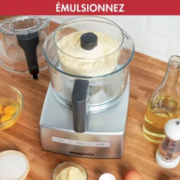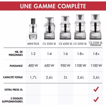Le robot MAGIMIX C.S. 3200 XL a été conçu pour vous simplifier la vie. Ainsi, il dispose de 3 bols transparents pour enchaîner les préparations. L’ensemble des bols et des accessoires se nettoie tout simplement au lave-vaisselle. Une boîte de rangement est fournie avec l’appareil.Quant aux réglages : impossible de se tromper ! Le moteur s’adapte automatiquement au type de préparation que vous souhaitez réaliser. Il dispose également d’une fonction Pulse pour faire mousser vos soupes et cocktails.