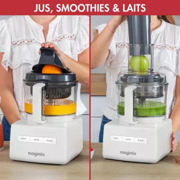 En plus des fonctions traditionnelles, ce robot offre aussi un BlenderMix, idéal pour réaliser des soupes à la fois crémeuses et légères, un presse agrumes et un extracteur Extra Press XL pour réaliser jus, smoothies et lais végétaux maison pleins de vitamines. Le robot MAGIMIX C.S. 5200 XL Premium s’accompagne également d’un coffret 3 disques parmesan, éminceur 1 mm et râpeur 6 mm. Ainsi que d’un livre de 100 recettes et d’une application gratuite.